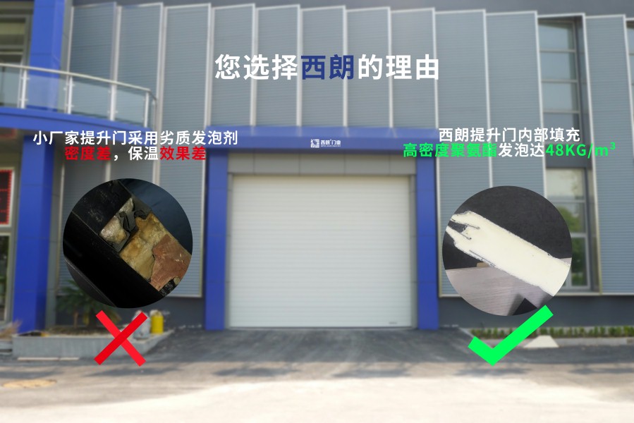 西朗工业提升门门板采用流水线生产,品质优良,形状美观,厚度达到40-50mm的高质量复合型门板材料,发泡的密封达到48kgs/m³,十分坚固,保温效果好。